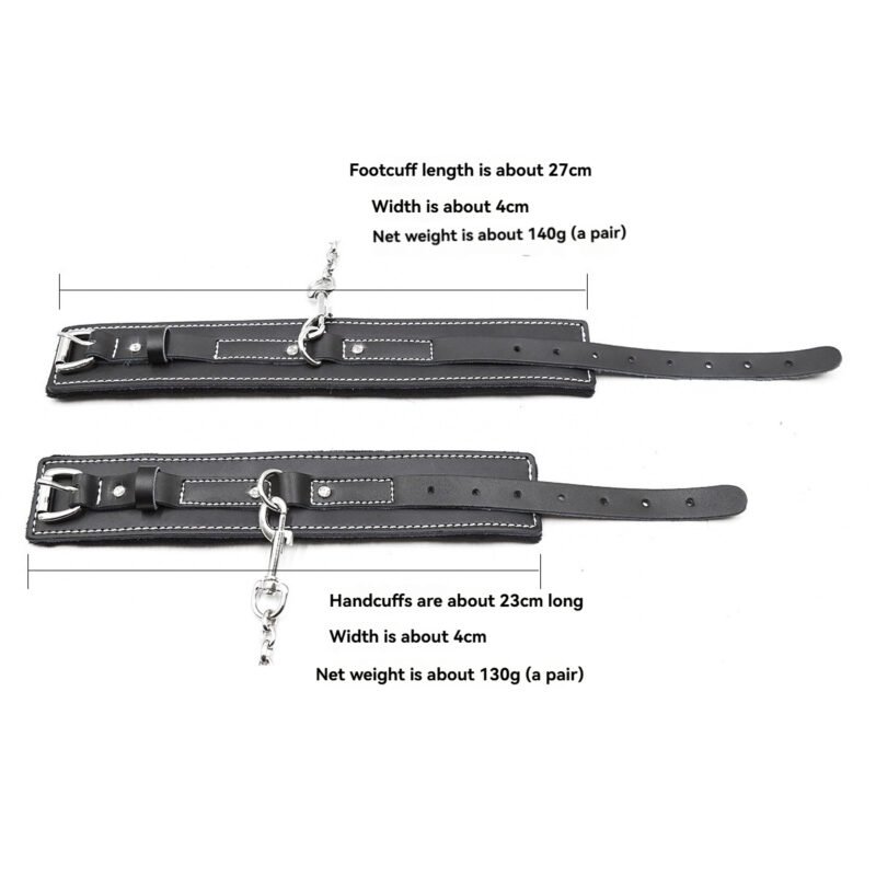 Handcuffs and Anklets: The handcuffs, around 23cm long and 4cm wide, weigh about 130g per pair. The anklets, 27cm long, 4cm wide, and 140g per pair, are both made with high – quality leather and sturdy metal components for secure restraint.