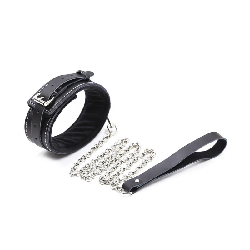 Collar and Leash: The collar, with a soft inner lining, ensures comfort while the attached chain and leather handle offer control. It’s adjustable for a perfect fit.