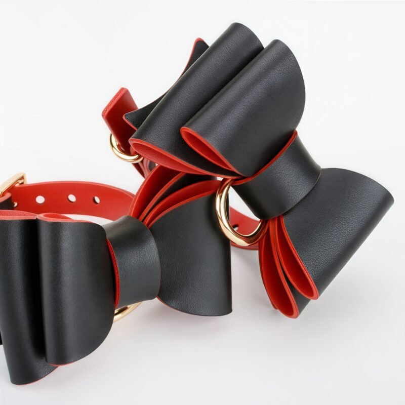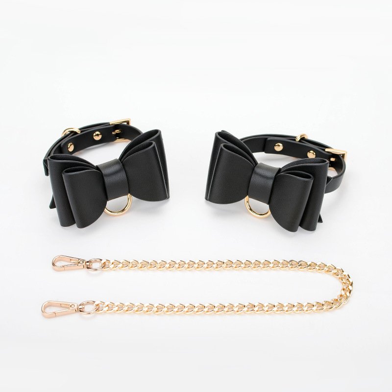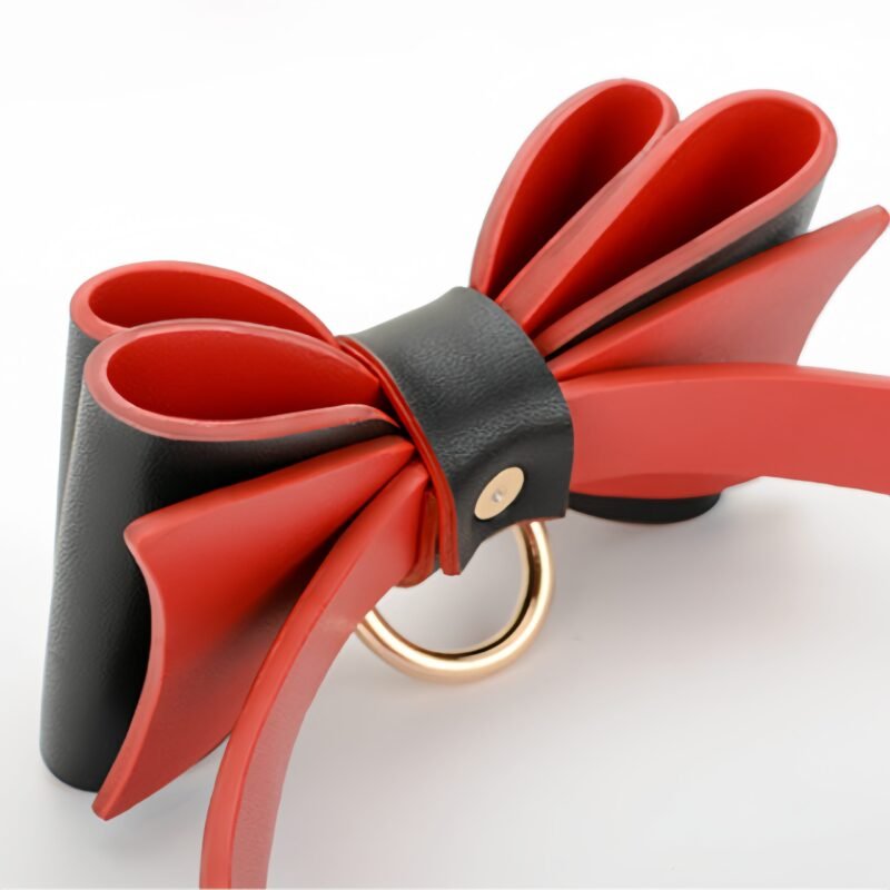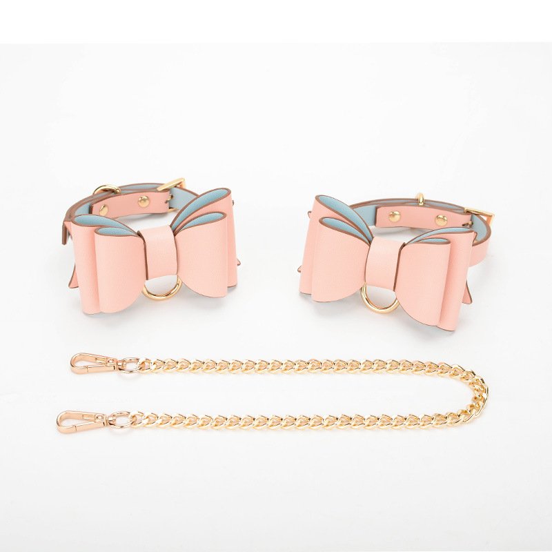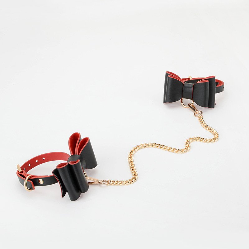 This chic connecting strap set includes a pair of PU leather straps adorned with bow accents and a metal chain. The leather straps are soft and comfortable, featuring adjustable buckles. The metal chain has convenient clasps at both ends for easy attachment. Available in black & red, black, and pink & blue