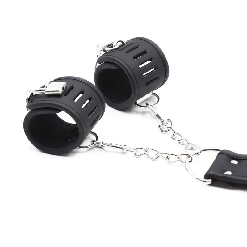 Handcuffs: Each handcuff is around 25cm long and 5cm wide, adjustable from 16 – 22.5cm, designed to restrain wrists effectively. The sleek black leather and metal components exude a sense of dominance.
